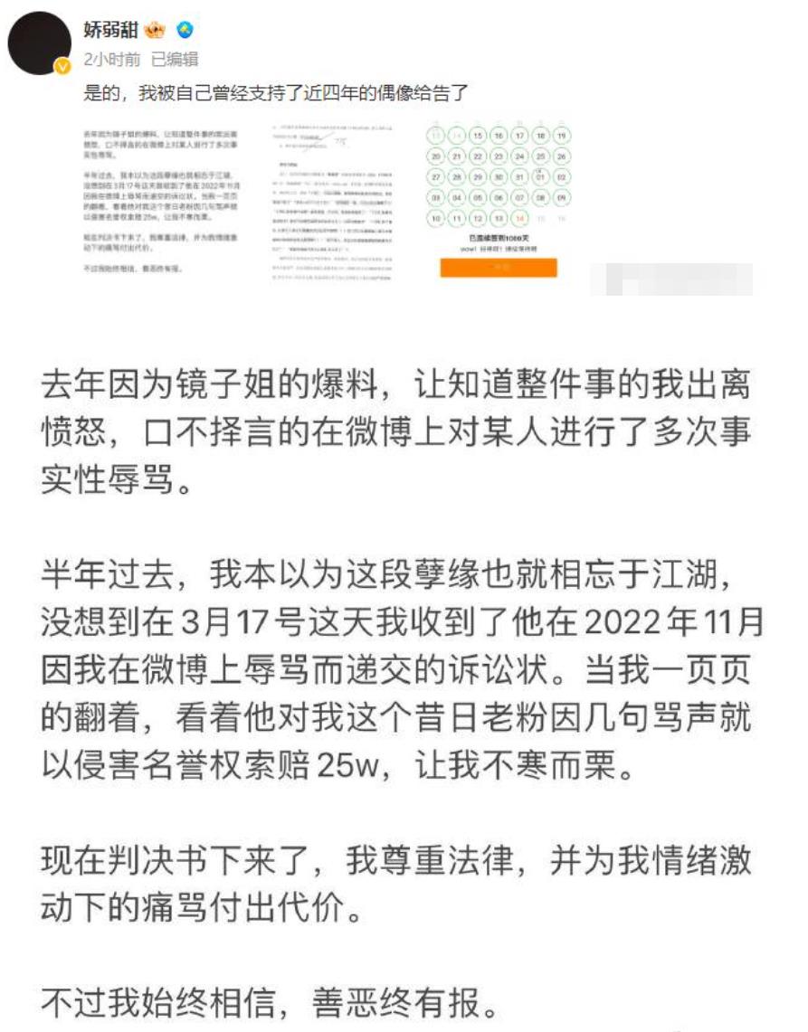 4️⃣ 还有一部分网友留言称,这位被告的粉丝并非那位说出“你是我唯一的姐”的人,而是在之前爆料帖下发表评论的另一个粉丝。这位被告的粉丝曾为丁泽仁创办过后援会账号,并为他花费了不少资金。他们认为,这位粉丝花了那么多钱,气愤之下回击了几句,却没想到最终被告赔偿25万元,遭遇了这样的结局。