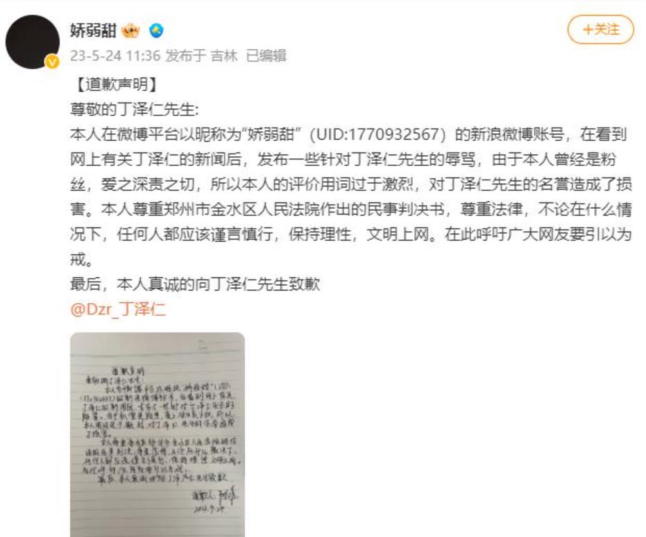 1️⃣ 5月24日,一位丁泽仁的粉丝在社交平台上发布了一则法律文书,指称自己因对丁泽仁发布侮辱、诽谤性言论,被丁泽仁起诉并索赔25万。据法律文书显示,该粉丝已向丁泽仁道歉,并法院判决的赔偿款项已履行。
