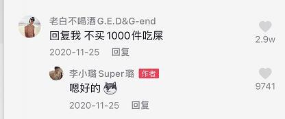 甚至还直接称李小璐为老婆,李小璐拍视频卖衣服,这名网友就说帮她买衣服,甚至直接买了1000件。当时这名网友在李小璐的抖音下面评论说不买1000件就吃屎,李小璐甚至还回复他了。