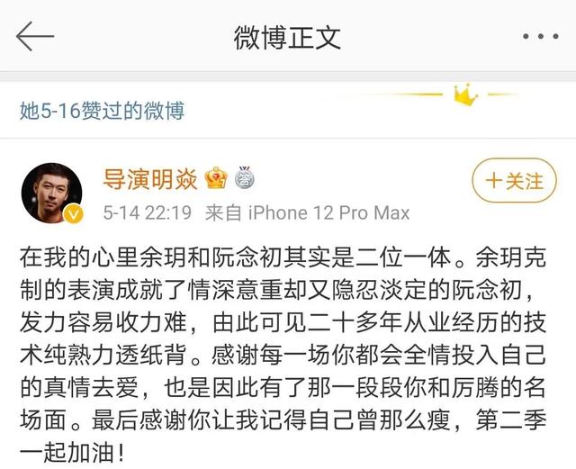 就连这部作品的导演明焱,都对余玥赞不绝口,他说:在我的心里余玥和阮念初其实是二位一体。余玥克制的表演成就了情深意重却又隐忍淡定的阮念初,发力容易收力难,由此可见二十多年从业经历的技术纯熟力透纸背。感谢每一场你都会全情投入自己的真情去爱,也是因此有了那一段段你和厉腾的名场面。