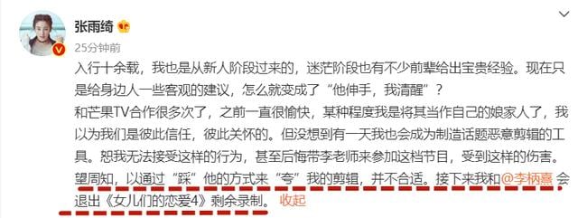 正在李柄熹处在万夫所指的境况时,一向很刚的张雨绮下场开撕芒果TV,其表示不能接受节目组踩一捧一的方式,并愤怒宣布退出余下几期的节目录制。