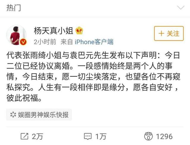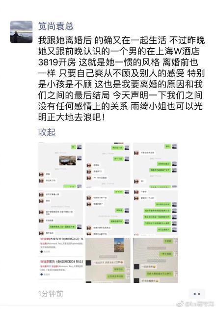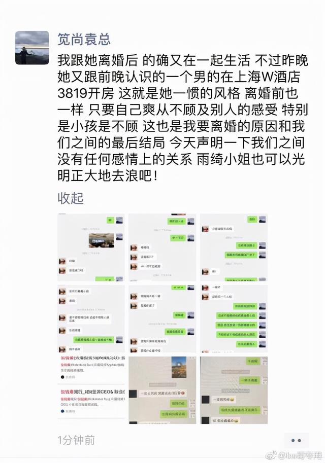2019年,张雨绮前夫袁巴元爆出张雨绮私生活放荡,并晒出其和刚认识的某男在上海某酒店3819房间开房的实锤。
