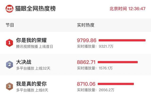 由迪丽热巴跟杨洋主演的浪漫主义爱情剧《你是我的荣耀》终于迎来开播,两大顶流的首次碰撞,收视热度注定不凡,上线当晚播放次数达到破亿,并且在猫眼电视剧排行榜上已经超过9000的热度登顶,在和奥运比赛撞期的同时,还能拥有这种人气,实属难得。