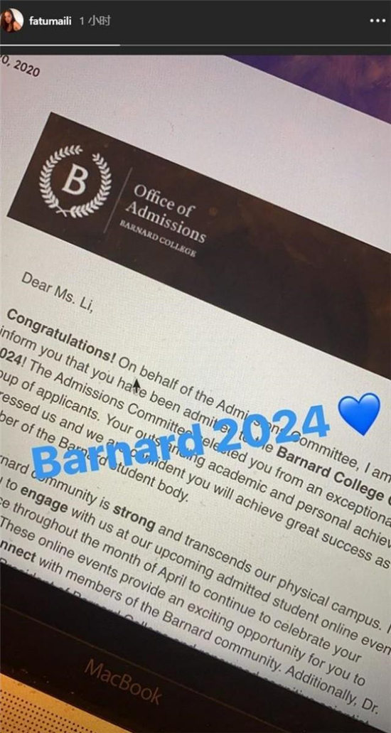 今年(2020)6月份中旬哈文在社交网晒出女儿法图麦高中毕业的纪念照,正式宣布其完成美国基础教育的K—12学业。18岁的法图麦早在去年(2019)九月份就申请哥伦比亚大学入学考试,今年3月份顺利考取其隶属巴纳德学院,同时晒出该所名校的英文录取通知书,骄傲、喜悦之情溢于言表。