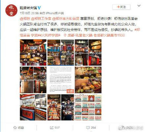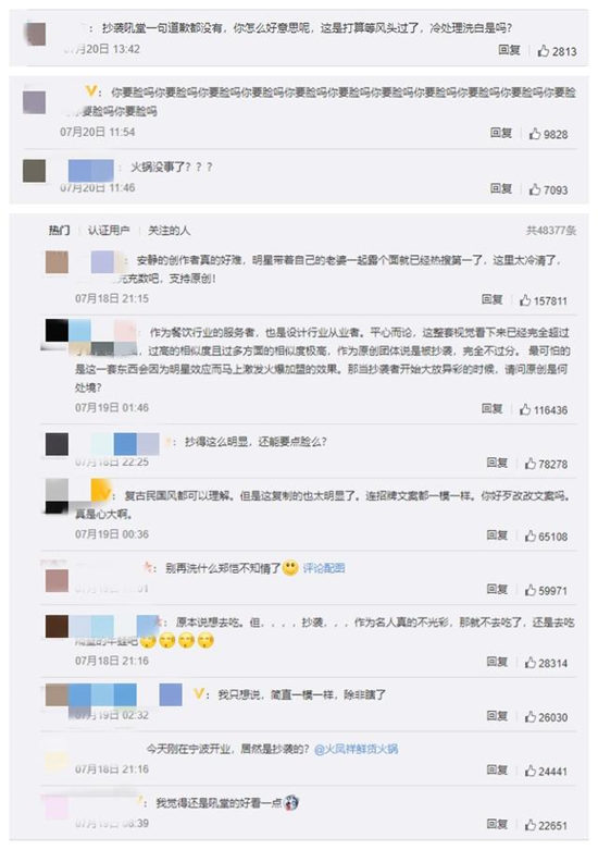 这次抄袭事件的爆发,更多网友扒出火凤祥前期的宣传。当时宣传上写着郑恺可是从头到尾都参与到店的管理“包括装修细节”,所以当出现这个问题大家看到声明后,将郑恺摘得一干二净。变成被道歉的对象,因为这一点网友们倍感气愤,深深的感受到了欺骗。