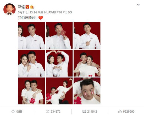 郑恺今年可真是一“红”到底,5月20号民政局的门槛都快被情侣们踩平了。与众不同的郑恺和苗苗在5月21号也是官宣结婚了。